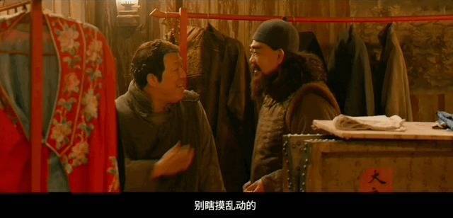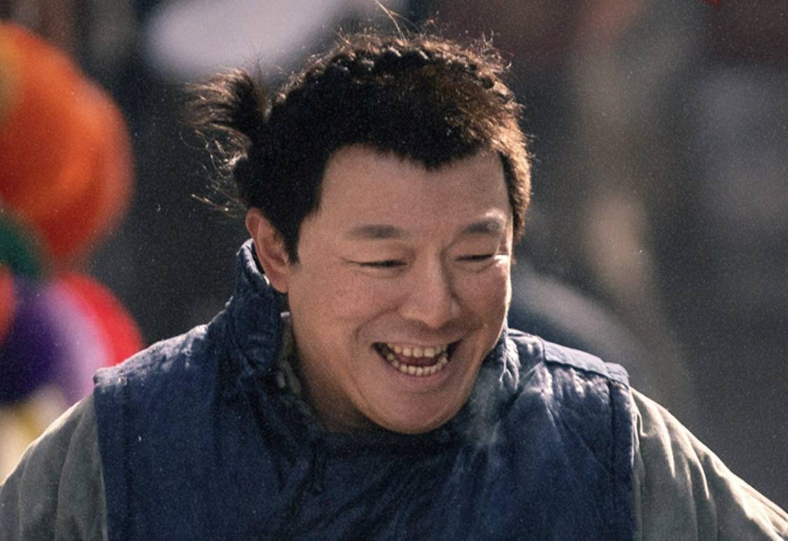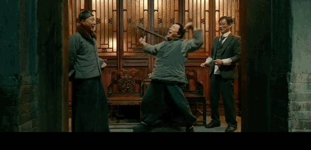 陈佩斯饰演的老班主,此前为求生存,不得不一桩桩应下大帅的荒唐请示,只敢砰砰下跪叩首,只敢哐哐撞柱子。