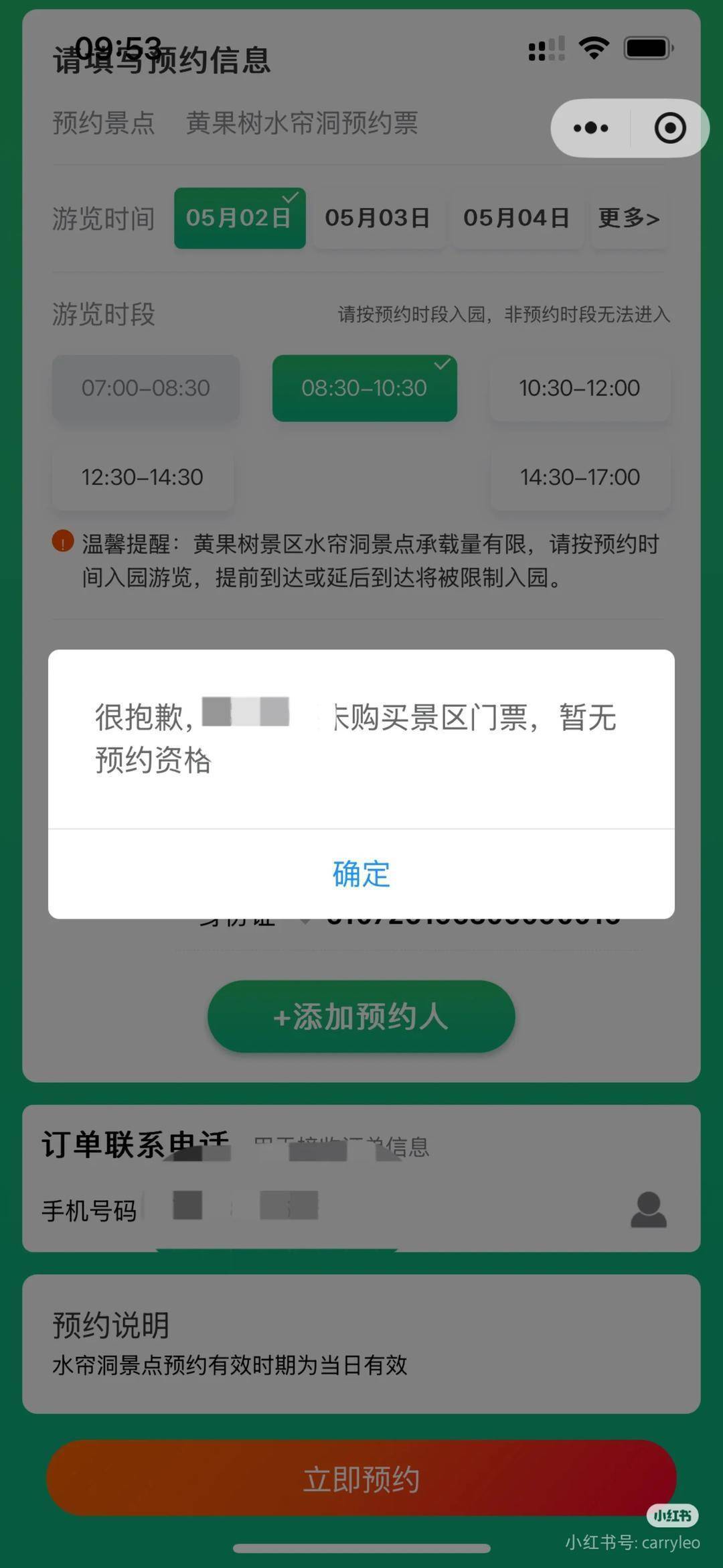 据她先容,因和家东谈主准备“五一”期间前去贵州游玩,4月23日,她在某平台购买了3东谈主“五一”期间游玩黄果树表象业绩区的门票。购票时,平台并未提醒景区水帘洞游览需预约。直到4月29日,她得知这一情况后赶快预约,但从上昼到下昼,3东谈主中仅有2东谈主预约收效,另一东谈主在预约时却指示“未购买景区门票,暂无预约经验”。