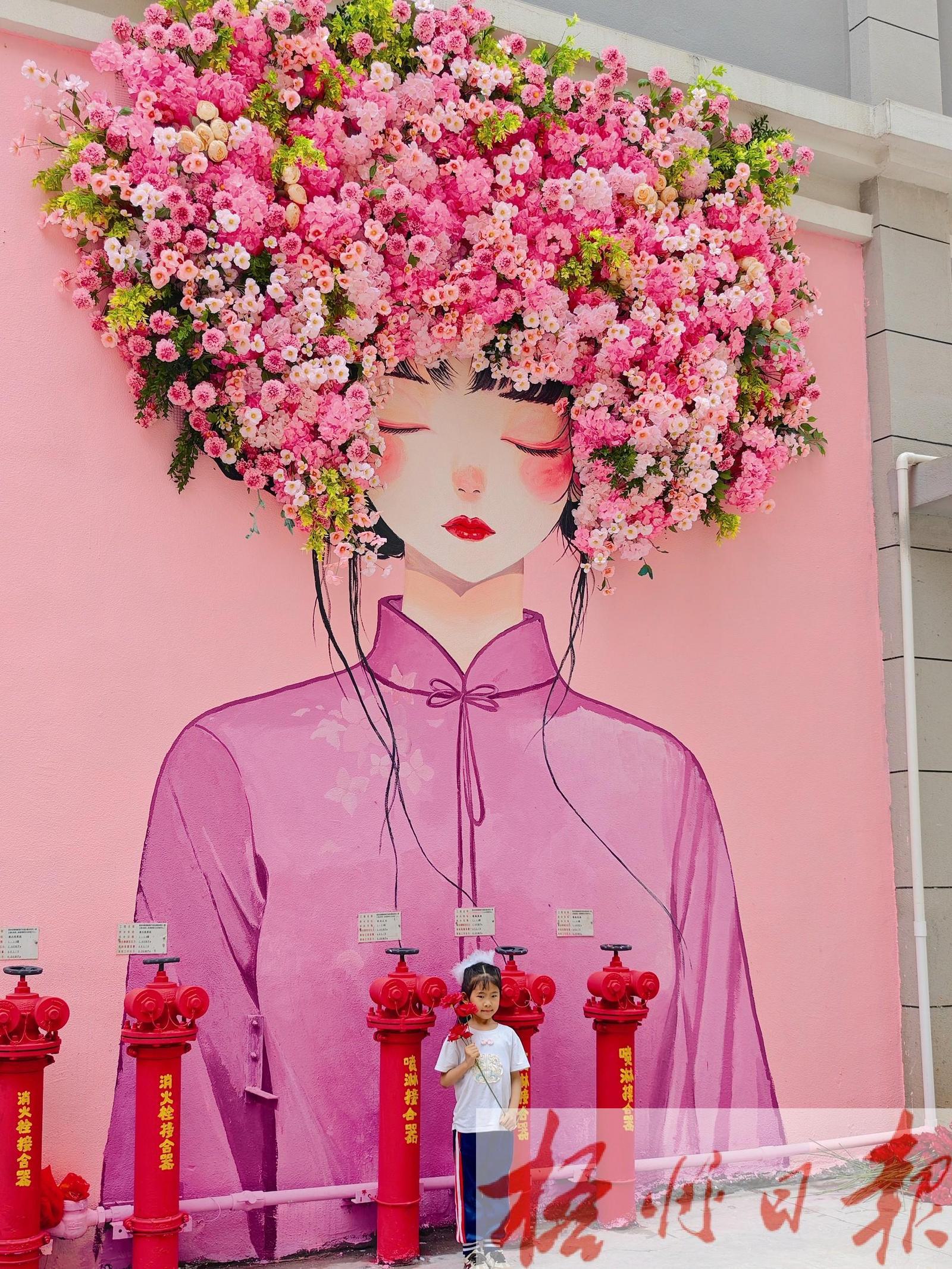 本年“五一”假期,骑楼城迎来客流岑岭,粉色仙女壁画墙前更是东说念主潮涌动。这幅巨型壁画以粉色为主色调,“仙女”身穿粉色穿戴、头戴立体花冠,合座融入骑楼建筑的雕花与灰墙之中,与附进古朴的骑楼街景情味横生。