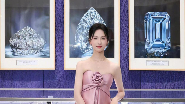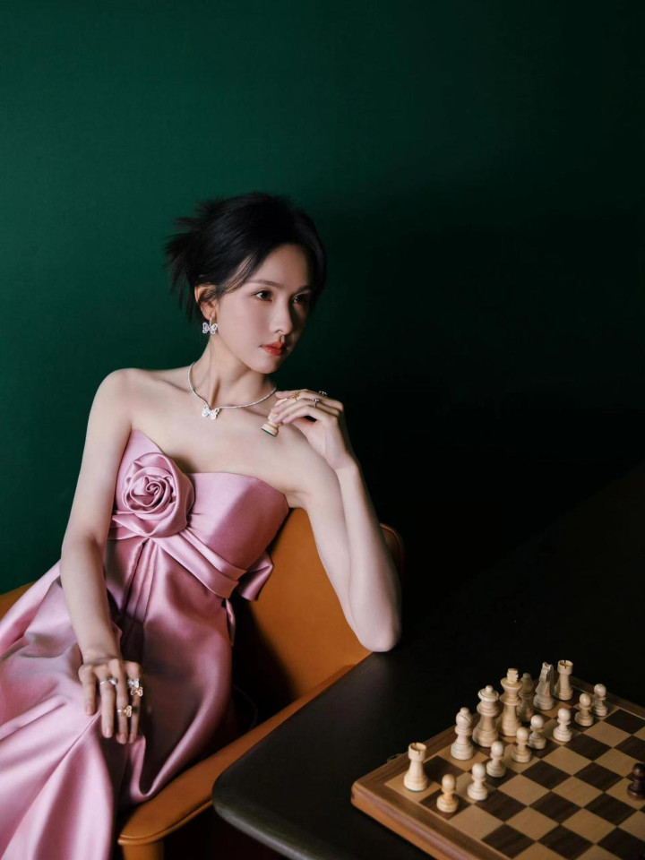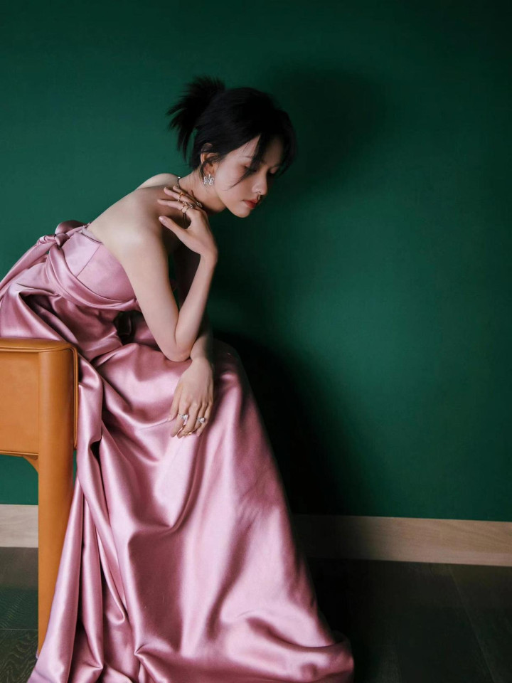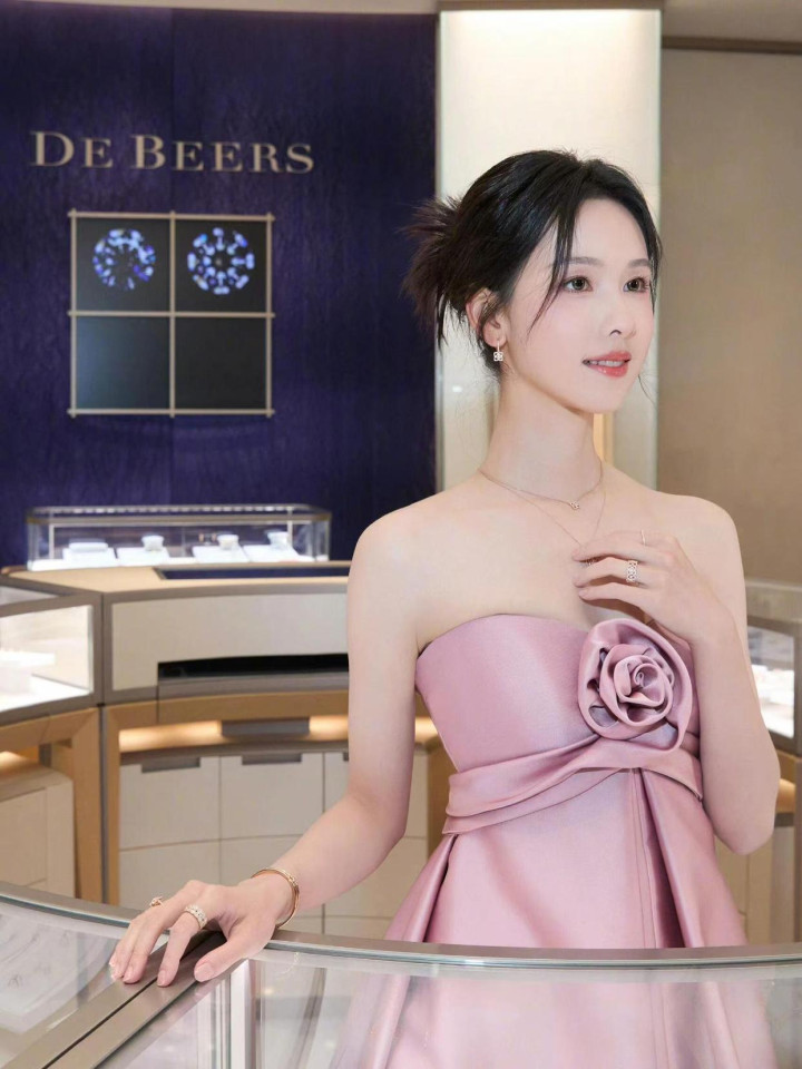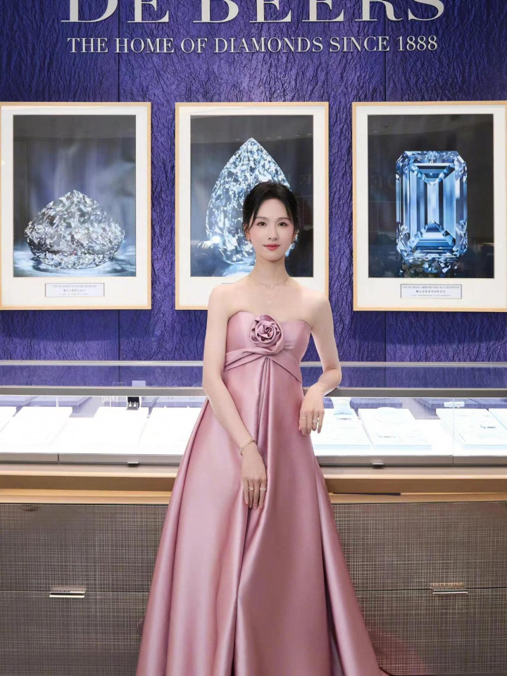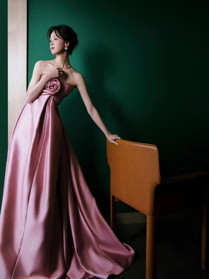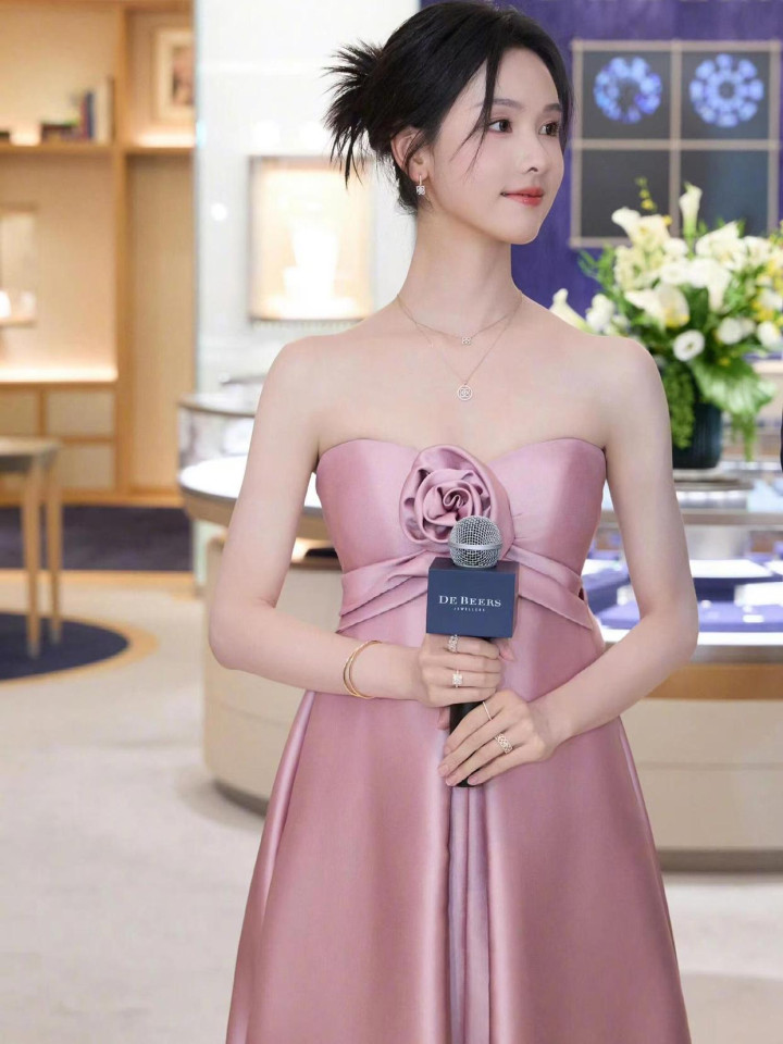 陈王人灵 32 岁粉裙造型,抹胸蓄意衬骨感,优雅身姿证据前锋品尝