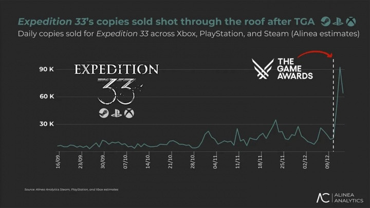 把柄游戏数据分析公司AlineaAnalytics的估算,自12月11日TGA盛典放胆后,《光与影:33号远征队》的销量在短技艺内猛增了近20万份。其中,仅授奖仪式后的阿谁周六,销量就达到了惊东谈主的9万份。看成对比,在TGA授奖前的三个月里,该游戏平均日销量约为1.2万份。
