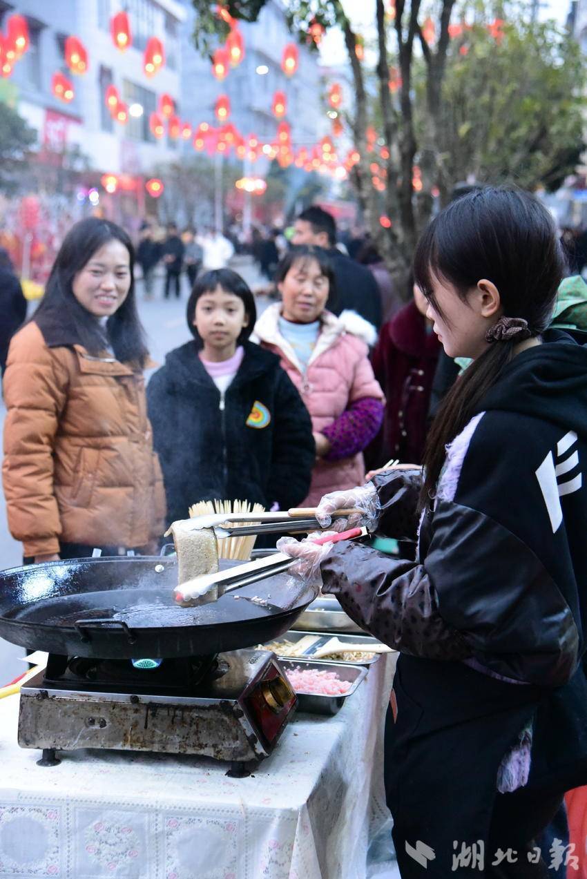 东谈主行谈上,打糍粑的木槌声此伏彼起,烫米粉的繁荣兴旺高潮。油茶汤在土灶上翻腾,炕洋芋滋滋作响,爆米花机“嘭”地炸开童年顾虑。麻糖扯出金丝,糖葫芦彻亮透亮,土家烧饼的焦香混着腊味飘过半条街。高笋塘羊肚菌、马倌屯草莓刚摆上就被扫码带走。手工编织篮里,装的不仅仅年货,更是归乡东谈主的担心。