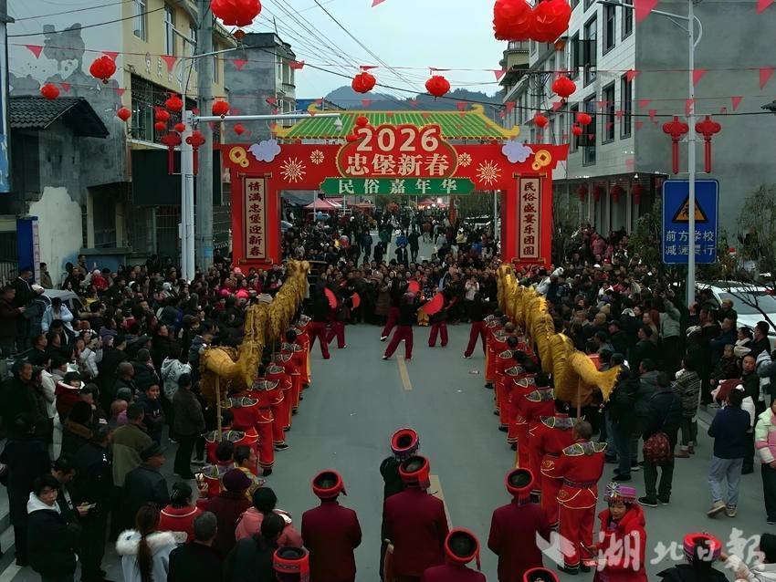 2月12日,农历腊月廿五晚,忠堡镇明星路化身风俗长街。18时整,草把龙从明星村委会动身,彩龙船、板凳龙紧随后来,沿街游弋。三棒饱读脆响,花锣饱读铿锵,摆手舞的队列越跳越长——2026年忠堡新春风俗嘉年华,在千余乡亲的容或中火热开演。