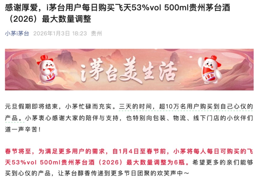 1月3日,i茅台发布公告,为焕发更多用户的需求,自1月4日至春节前,将每东谈主逐日可购买的飞天53%vol 500ml贵州茅台酒(2026)最大数目退换为6瓶。